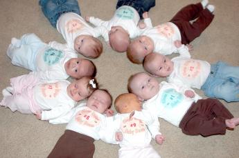 (Babies below are pictured in order from #1 to #9. Their birth order is listed on their individual onesies with Baby #9 in the 6 o'clock position and Baby #4 at the 12 o'clock position.)